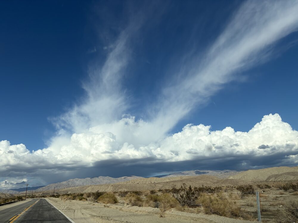 A line of developing storms spotted while looking east toward the western border of Joshua Tree National Park behind the Indio Hills, near Sky Valley, California, US