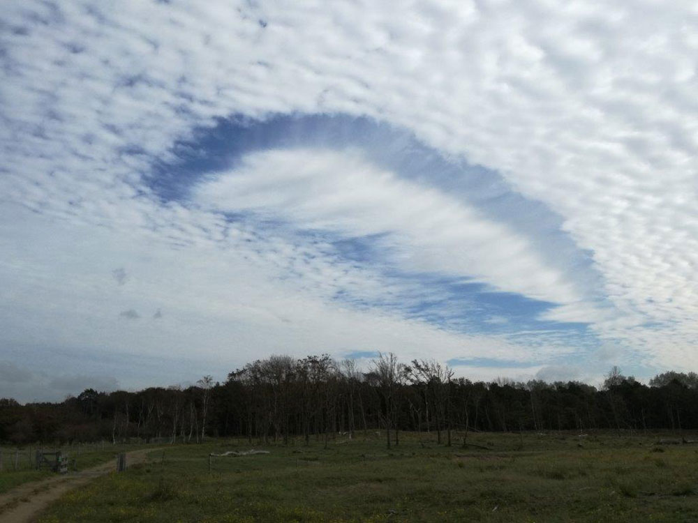 Lacunosus, a relatively rare and short-lived cloud formation, takes on the look of a honeycomb pattern of round holes with frayed edges. It is formed when a layer of rising warm air and a layer of cold air come into contact with one another, causing downdrafts that push through the cloud. This classic example was spotted by Alexia's friend, Bob Hunter, near Lexington, Virginia, US.