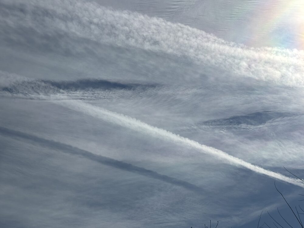 A contrail and a distrail, along with signs of a fallstreak hole (cavum), spotted over Falls Church, Virginia, US