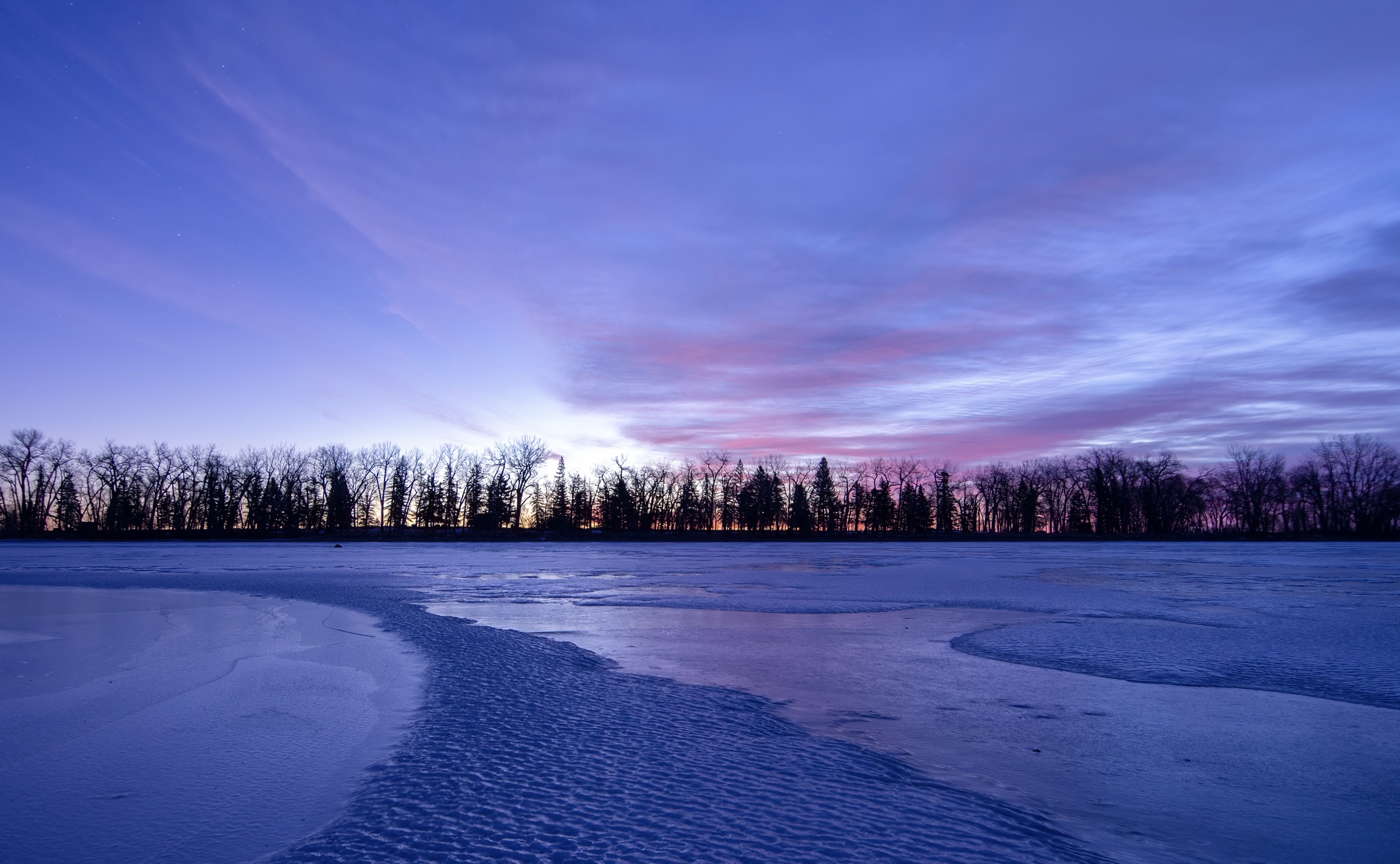 Winter Solstice sunrise mirrored in texture upon a frozen lake in Southern Alberta, Canada