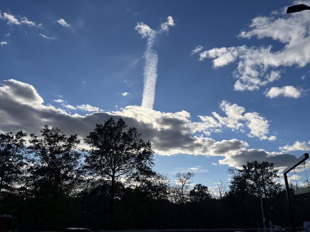 Remnants of a nearby contrail gives the illusion that its coming upward from the cloud below, spotted over Whitestone, New York, US