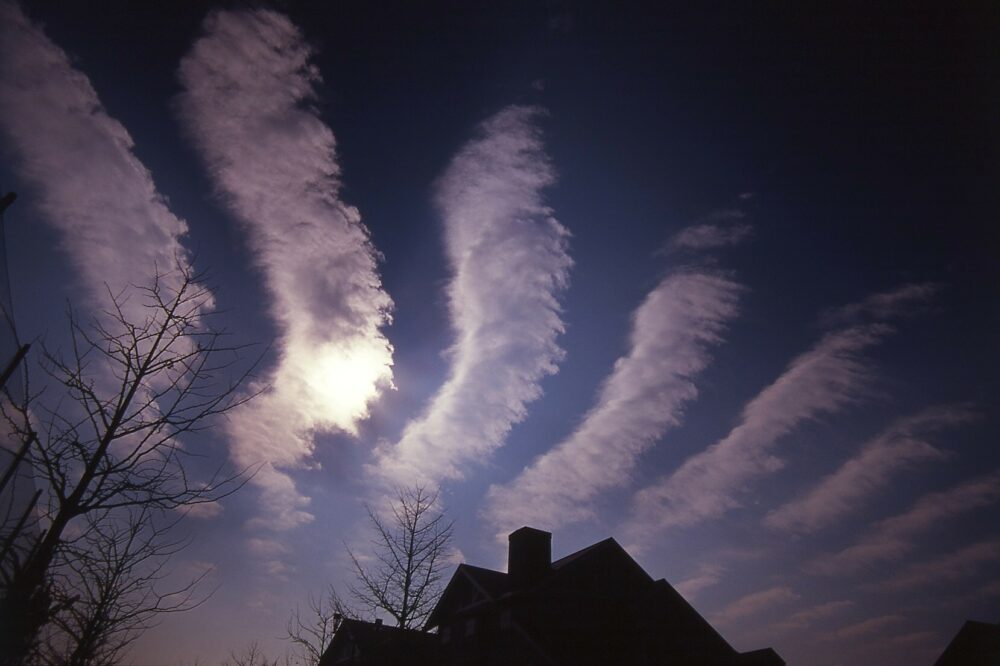 Remnants of contrails in the morning sky over Falls Church, Virginia, US
