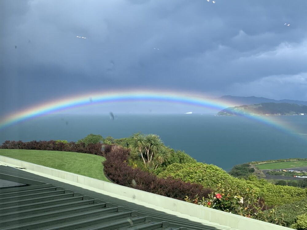 A vivid rainbow spotted over Wellington Harbour, New Zealand