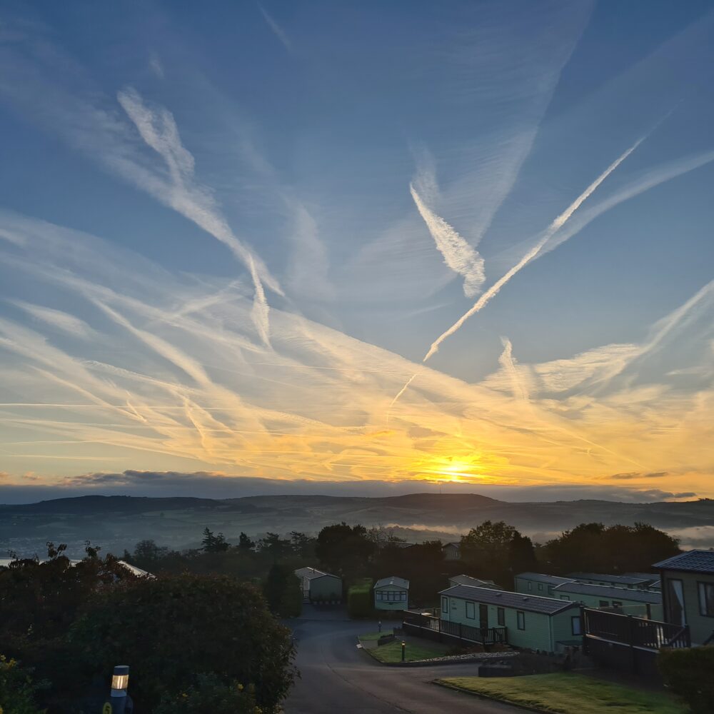 A plethora of contrails illuminated by the sunset over Conwy, North Wales