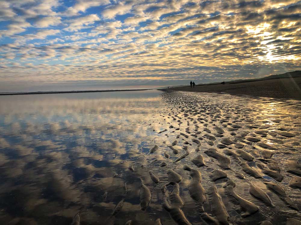 The clouds mirrored in the beach at Scheveningen, Holland.