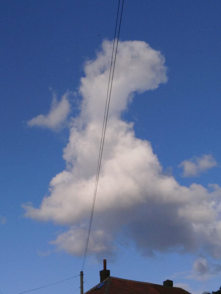 Stepping out of his door one day, Colin saw this vision of Great Britain painted in the sky: 'A line drawn down the length of a map of England and Scotland - the 400-mile road taken by architecture critic Ian Nairn, photographing whatever caught his eye.' (Gillian Darley) Colin spotted this revealing cumulus cloud over Leeds, England.