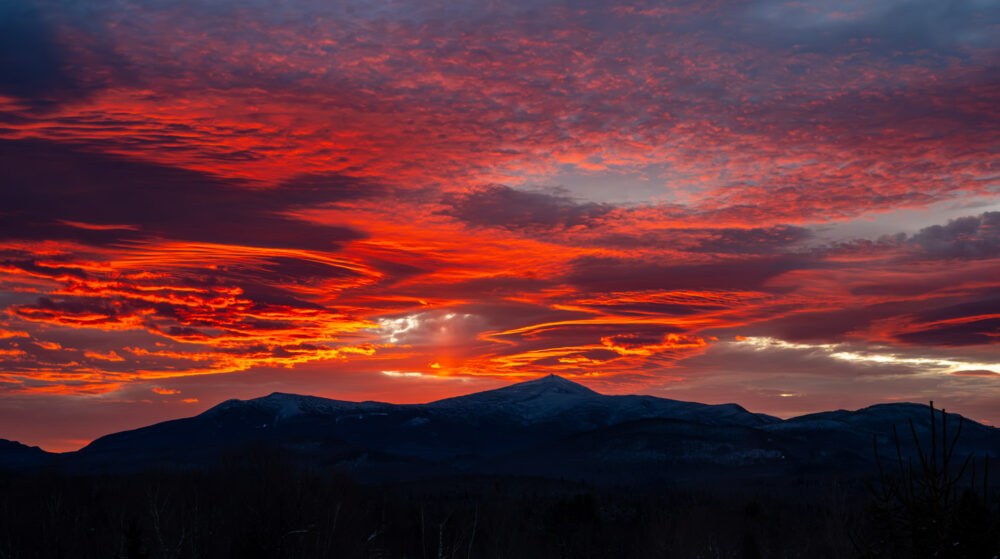 Sunrise with a subtle sun pillar to the left of Whiteface Mountain, near Vermontville, Adirondacks, New York, US