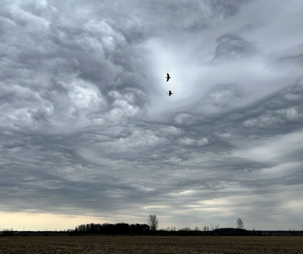 Canada geese flying underneath a layer of Asperitas over North Dundas Township, Ontario, Canada