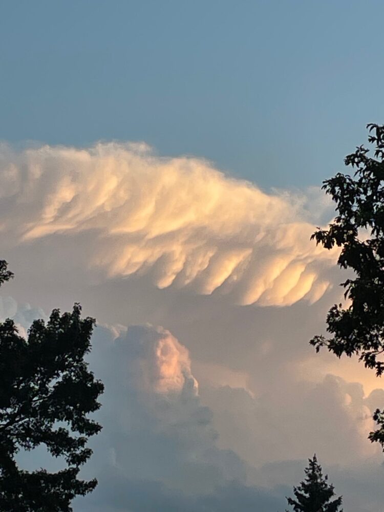 A red light, appearing to indicate foreboding skies ahead, with mammatus (mamma) spotted at sunset over Arlington, Virginia, US