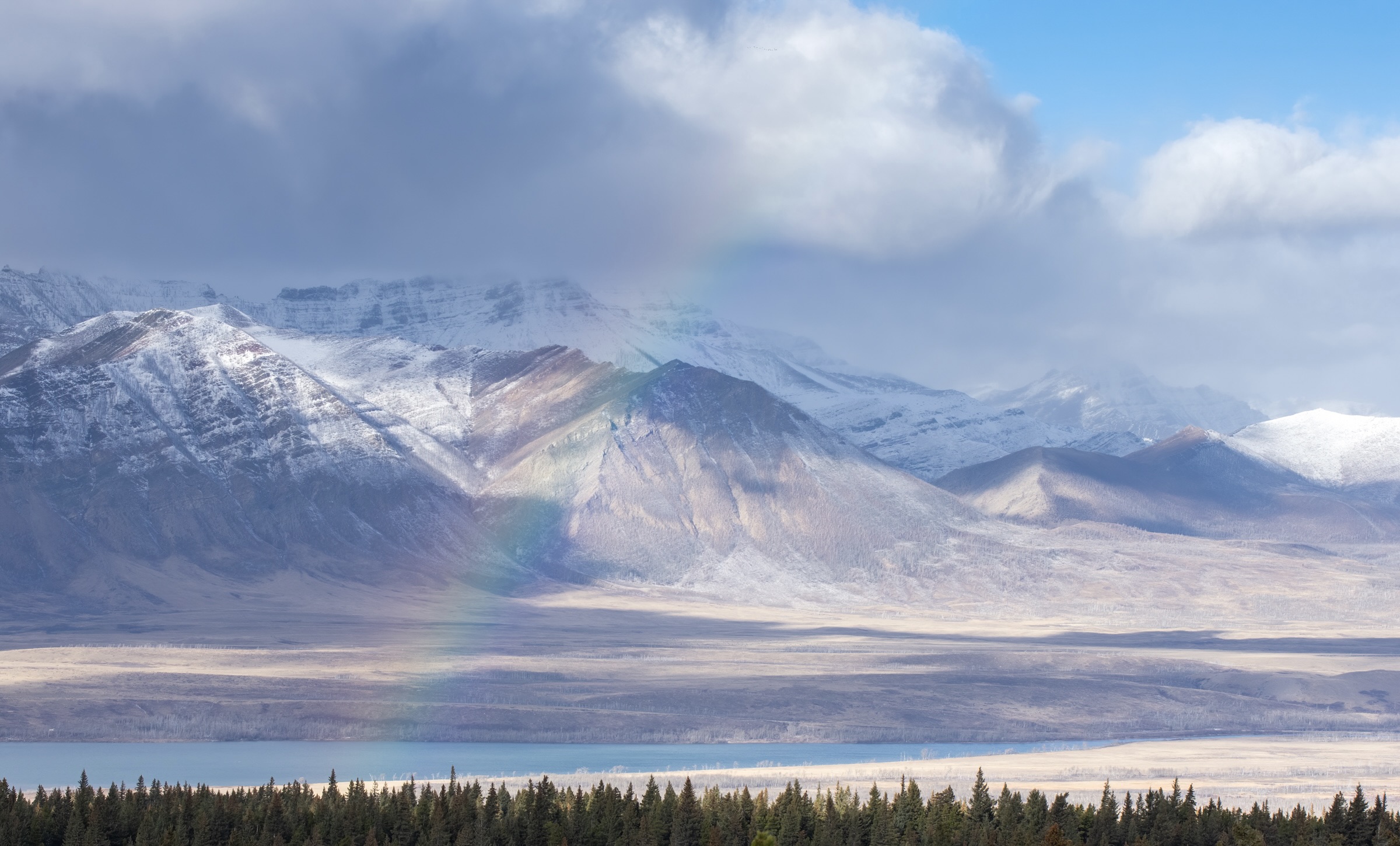 An elusive winter rainbow spotted over Waterton Lakes National Park, Alberta, Canada