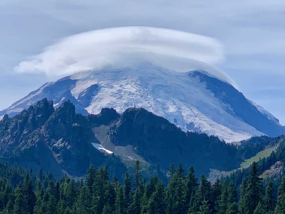 A cloud-capped Mount Rainier, Washington State, US.