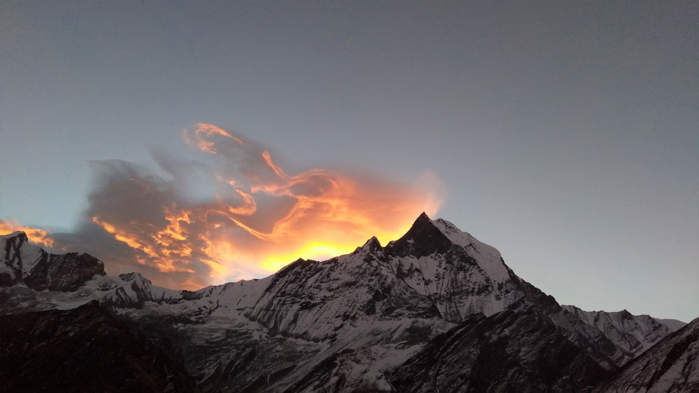 A sunrise over Mount Macchapuchre, Nepal.