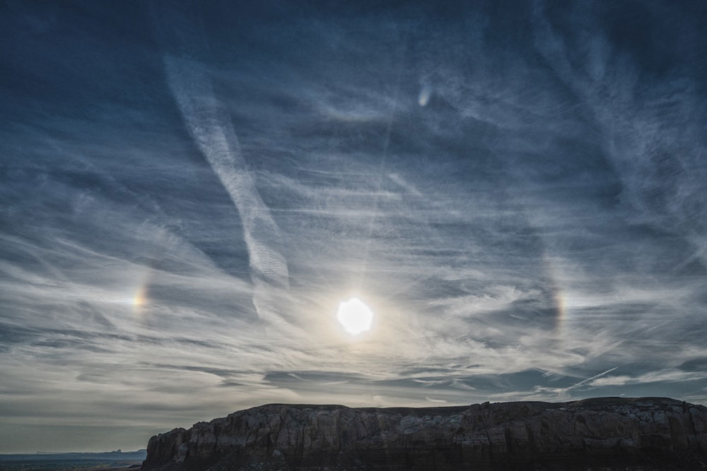 A halo, Sundogs and upper tangent arc over Bluff, Utah, US.