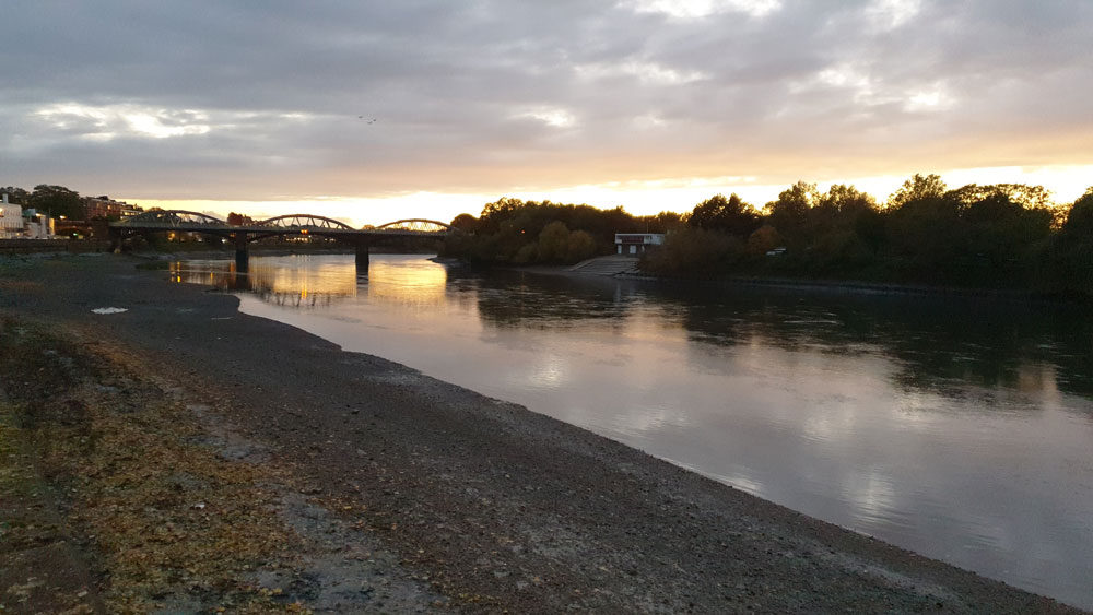 A sunset over Barnes Bridge, the river Thames, London, UK.