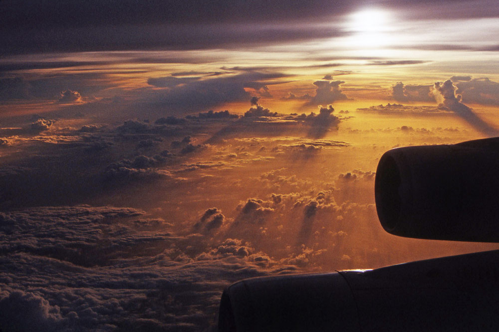 Contrails headed in the direction of the horizon, during sunrise over Silver City, New Mexico, US