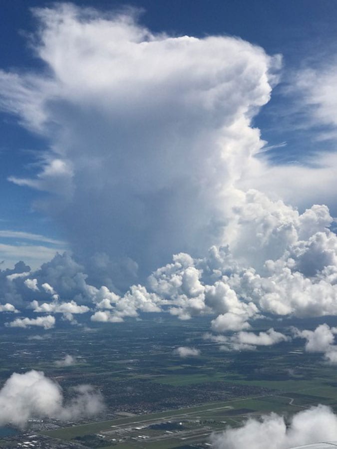 A view from above the clouds over Miami, Florida, US.
