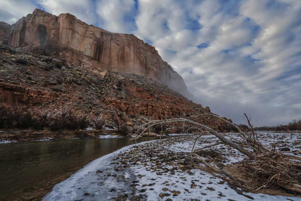 Clouds and fog over the San Juan river at sunrise over Bluff, Utah, US.