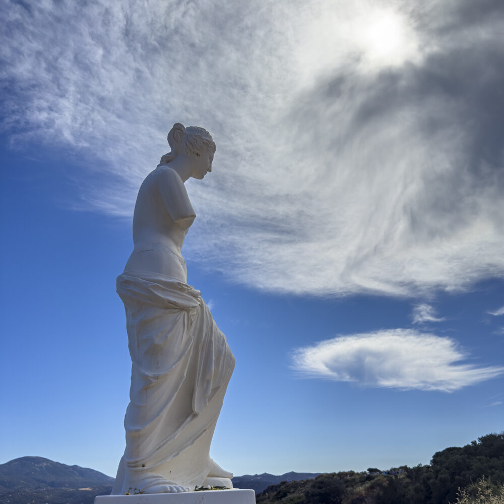 A swirl of clouds spotted above an exact plaster replica of the statue Aphrodite of Milos, in Milos, Greece