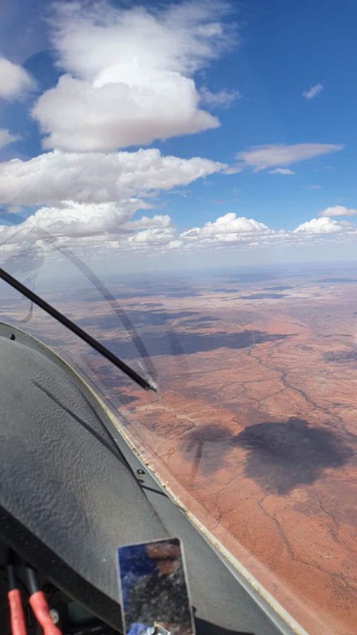 A view from the cockpit of a glider over central Western Australia.