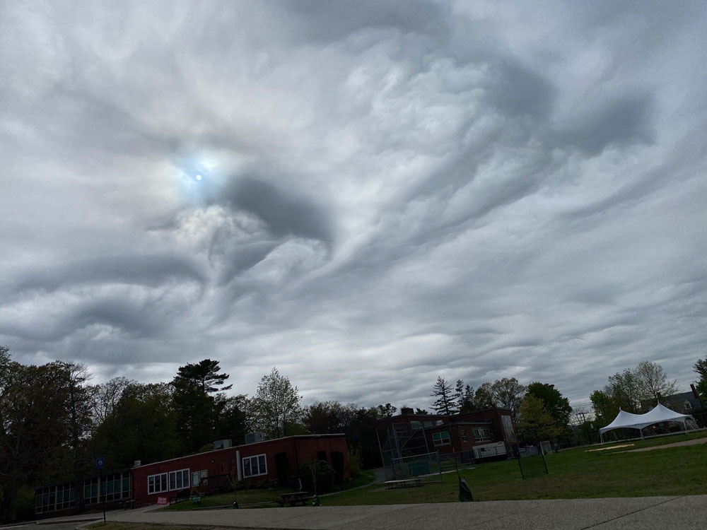A unique view of two Fallstreak Holes (Cavum), along with the sun located 'in' the smaller one, spotted over Harkness State Park Beach, Waterford, Connecticut, US