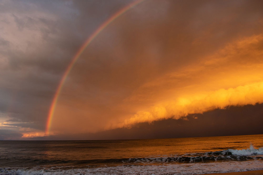 A storm front and rainbow over Seven Mile Beach at Shoalhaven Heads, NSW, Australia.