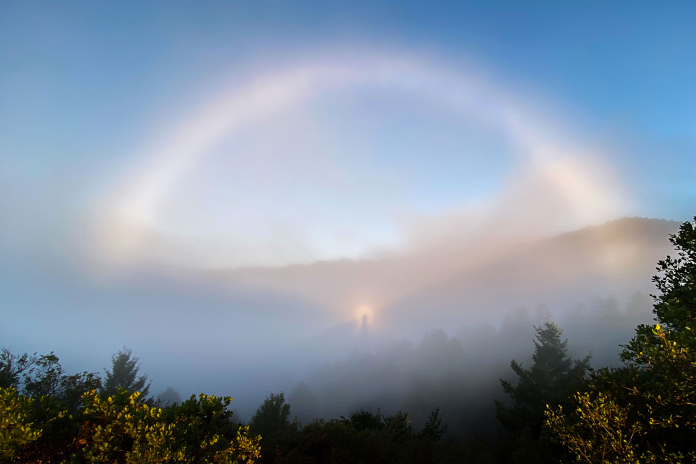 A fogbow and Brocken spectre over the Muir Woods National Monument, Marin County, California, US.