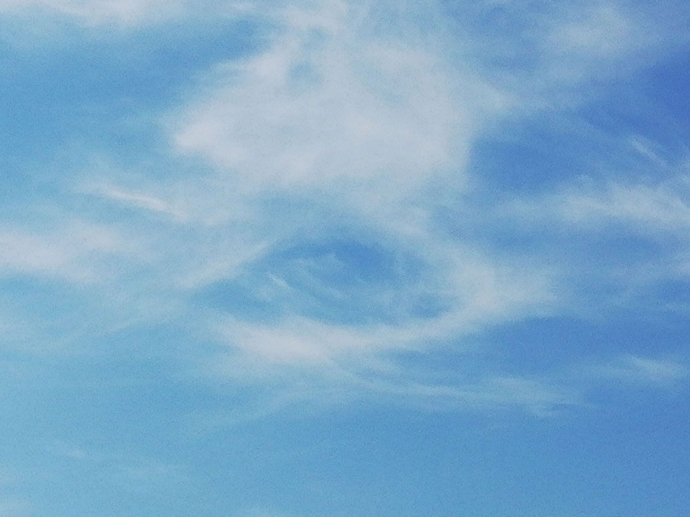 Fallstreak Hole (Cavum) in the shape of a heart and with a view of the blue sky, spotted following a week of rain in Waikiki, Honolulu, Hawaii, US