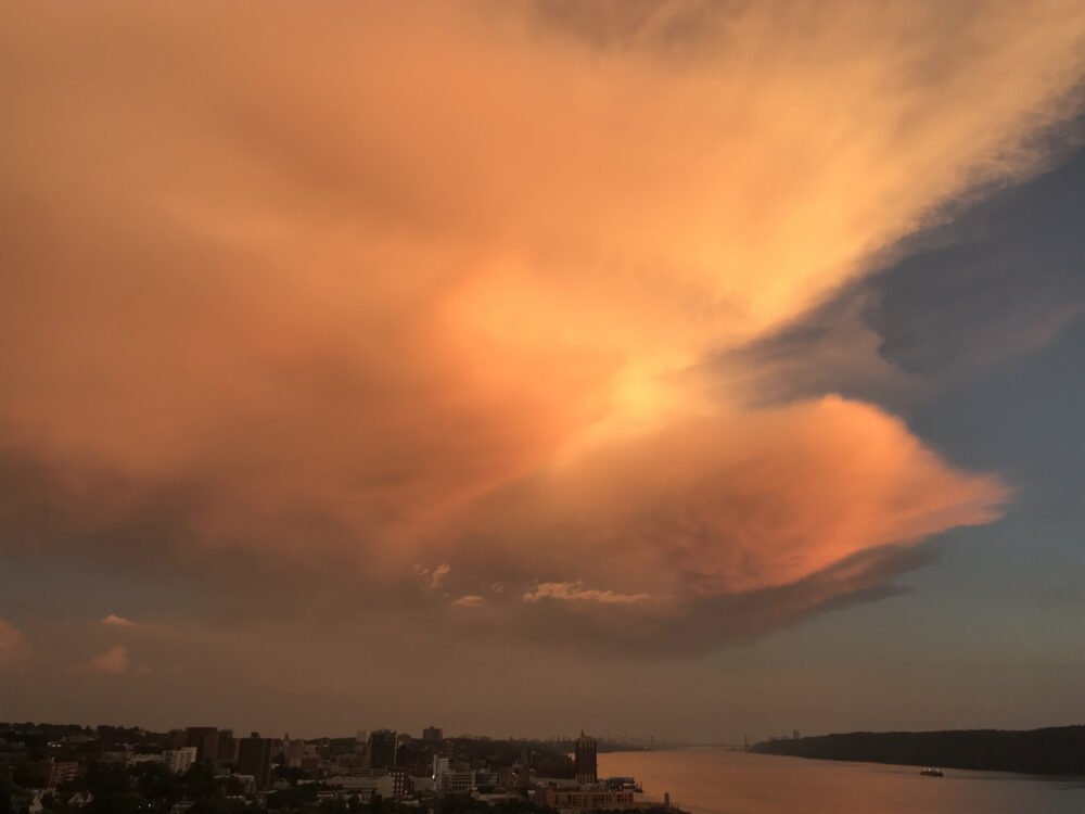 A giant bird hovering over Manhattan at sunset, spotted looking south from Westchester, New York, US