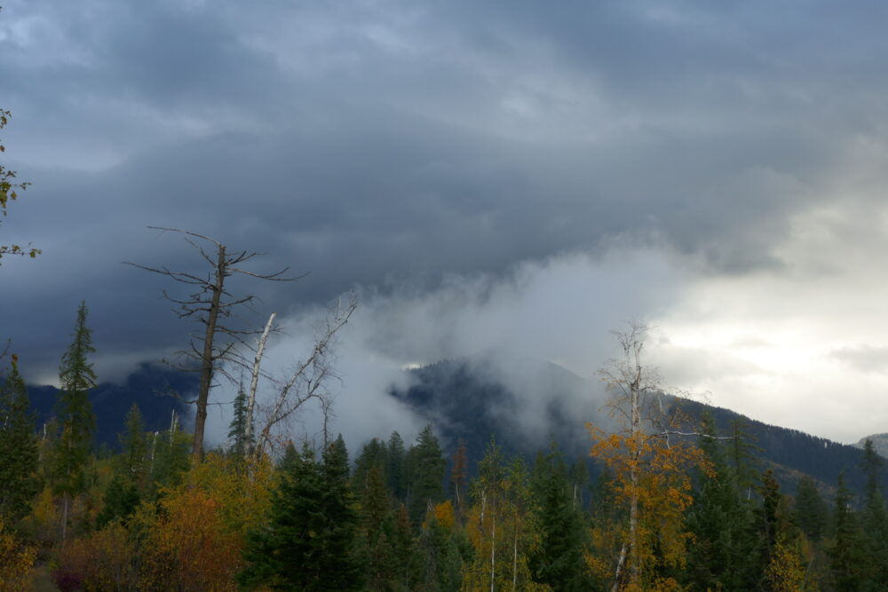 Fog and fall foliage spotted during a bike ride near Bigfork, Montana, US