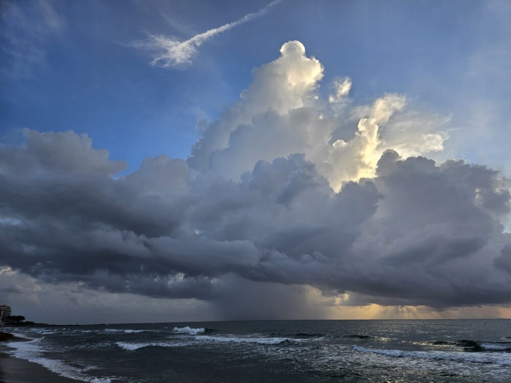Rainfall and crepuscular rays spotted side-by-side over the Atlantic Ocean, near Boca Raton, Florida, US