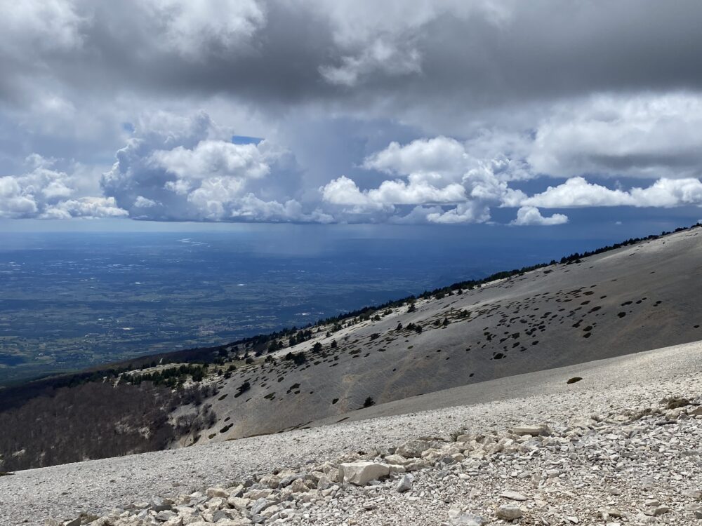 A view of precipitation that appears to be reaching the ground, spotted from atop Mount Ventoux, Provence, France
