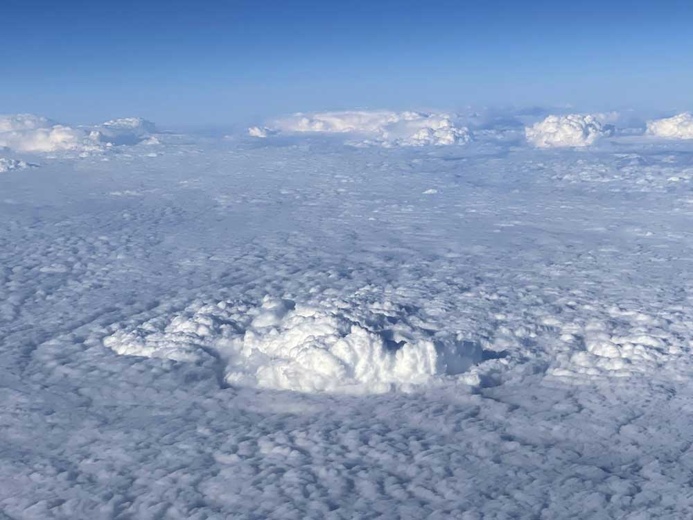 Clouds bubbling up out of the blanket below, spotted on a flight from Dallas to North Carolina, US.