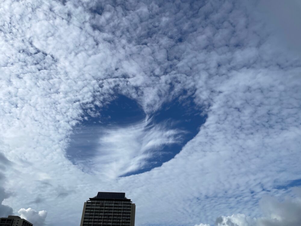 Fallstreak Hole (Cavum) in the shape of a heart and with a view of the blue sky, spotted following a week of rain in Waikiki, Honolulu, Hawaii, US
