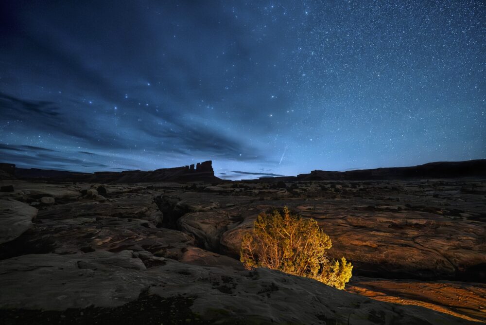 A pre-dawn view two hours prior to sunrise, with the comet Pan/STARRS visible near the horizon, spotted over the Glen Canyon Recreation Area, Utah, US