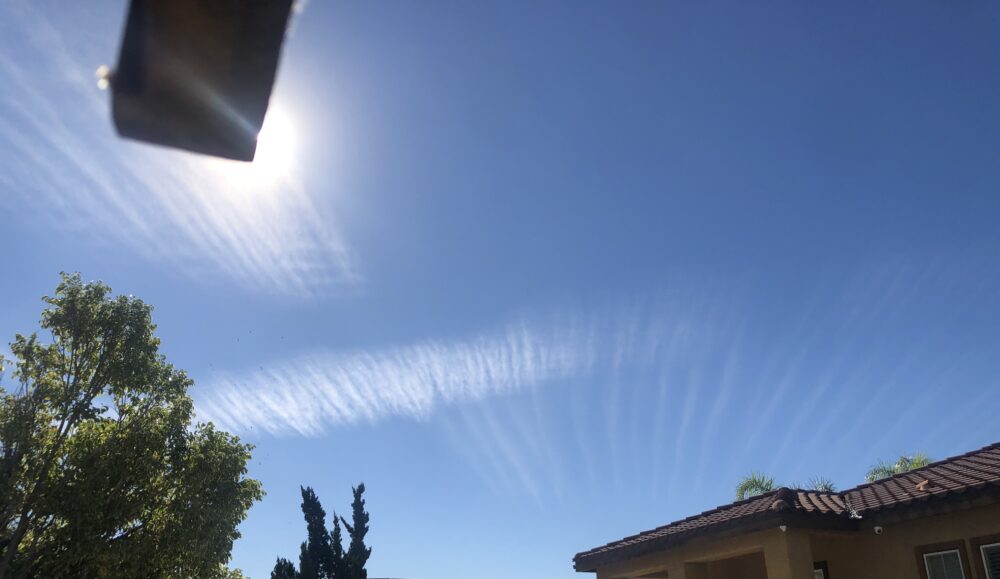 Signs of remnants of contrails, with upper level winds spreading it out perpendicular to its original pathway, spotted over San Bernardino County, California, US