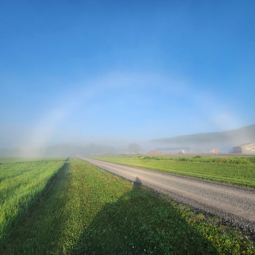 Fogbow, a relatively rare, white rainbow-like arc that is formed by sunlight interacting with water droplets in fog, spotted in the early morning near Hurley, New York, US