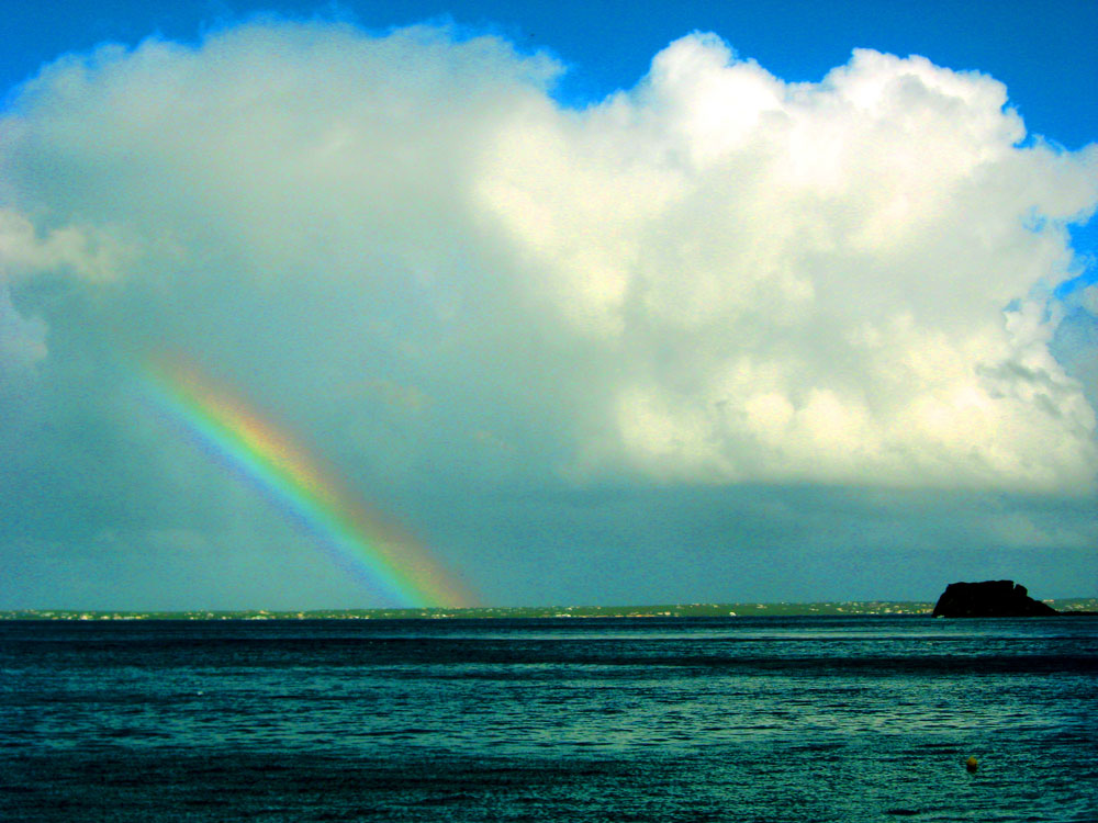 A rainbow and storm system over the St. Martin shoreline. The Caribbean Sea.