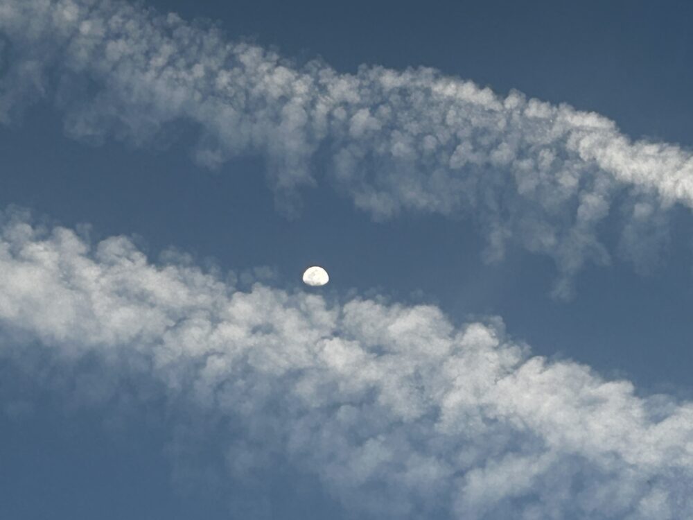 Remnants of contrails framing the moon in the afternoon sky, spotted prior to sunset over Carson, California, US