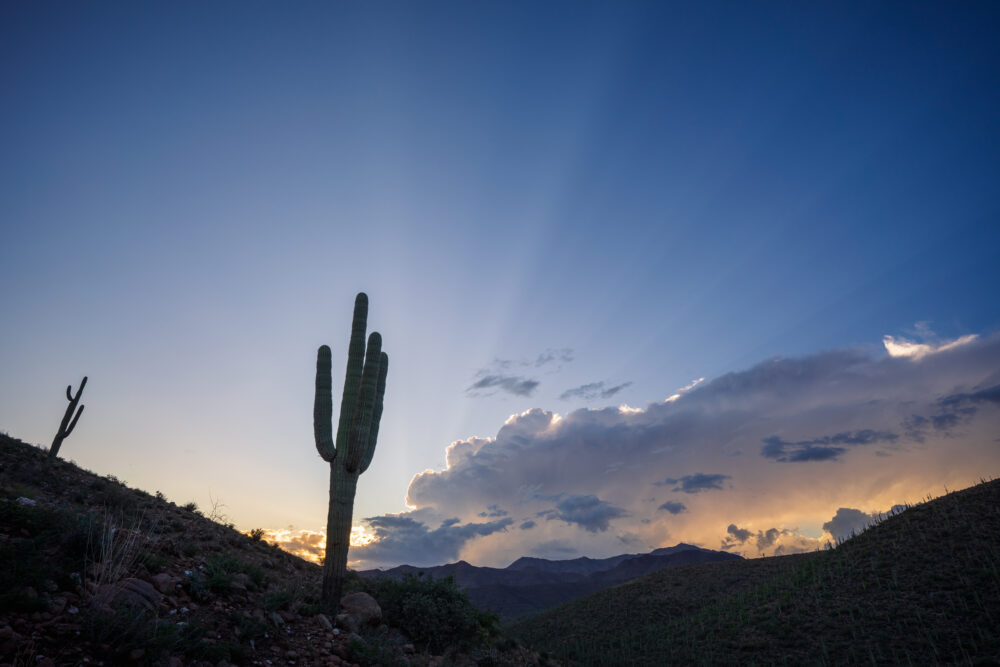 Crepuscular rays and shadows illuminate the sky at sunset, following a fast moving storm near Tonto National Forest, Arizona, US