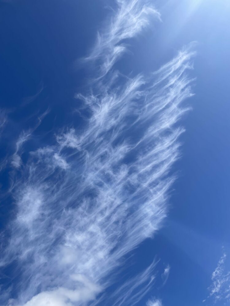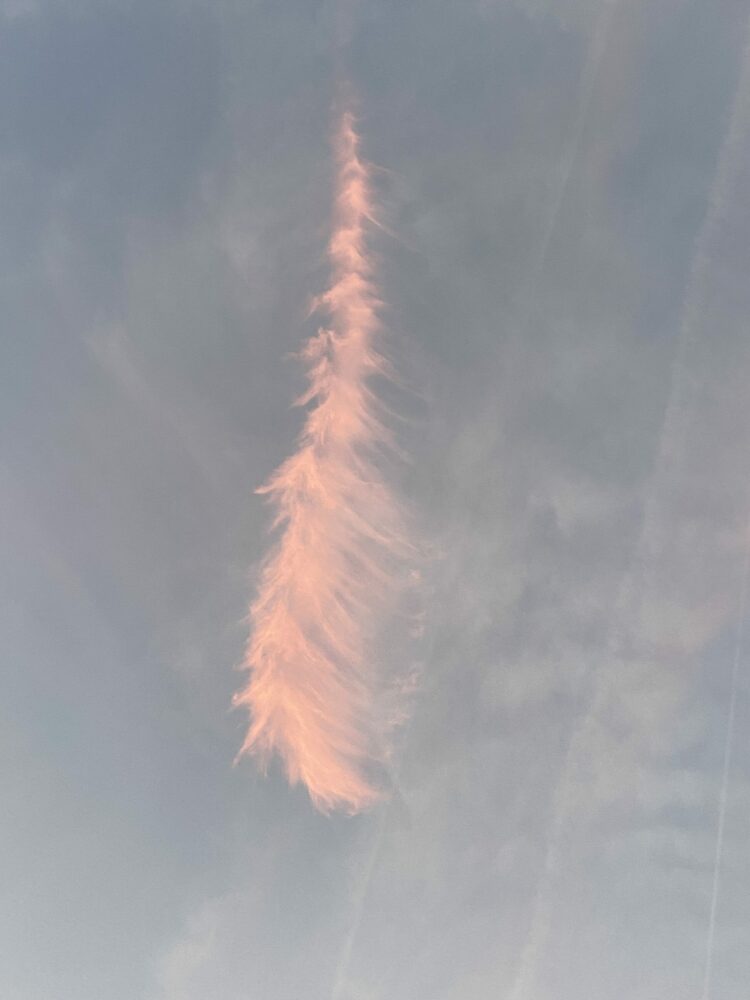 A feather-like cloud forms from the remnants of a contrail, spotted over Cirencester, England