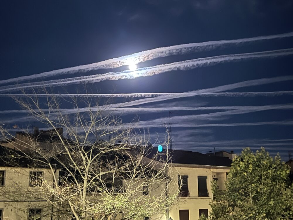 A plethora of contrails illuminated by the full moon, spotted over Covarrubias, Burgos, Spain