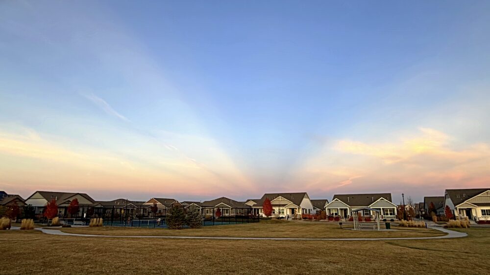 Anti-crepuscular rays spotted looking east at sunset, over Brighton, Colorado, US