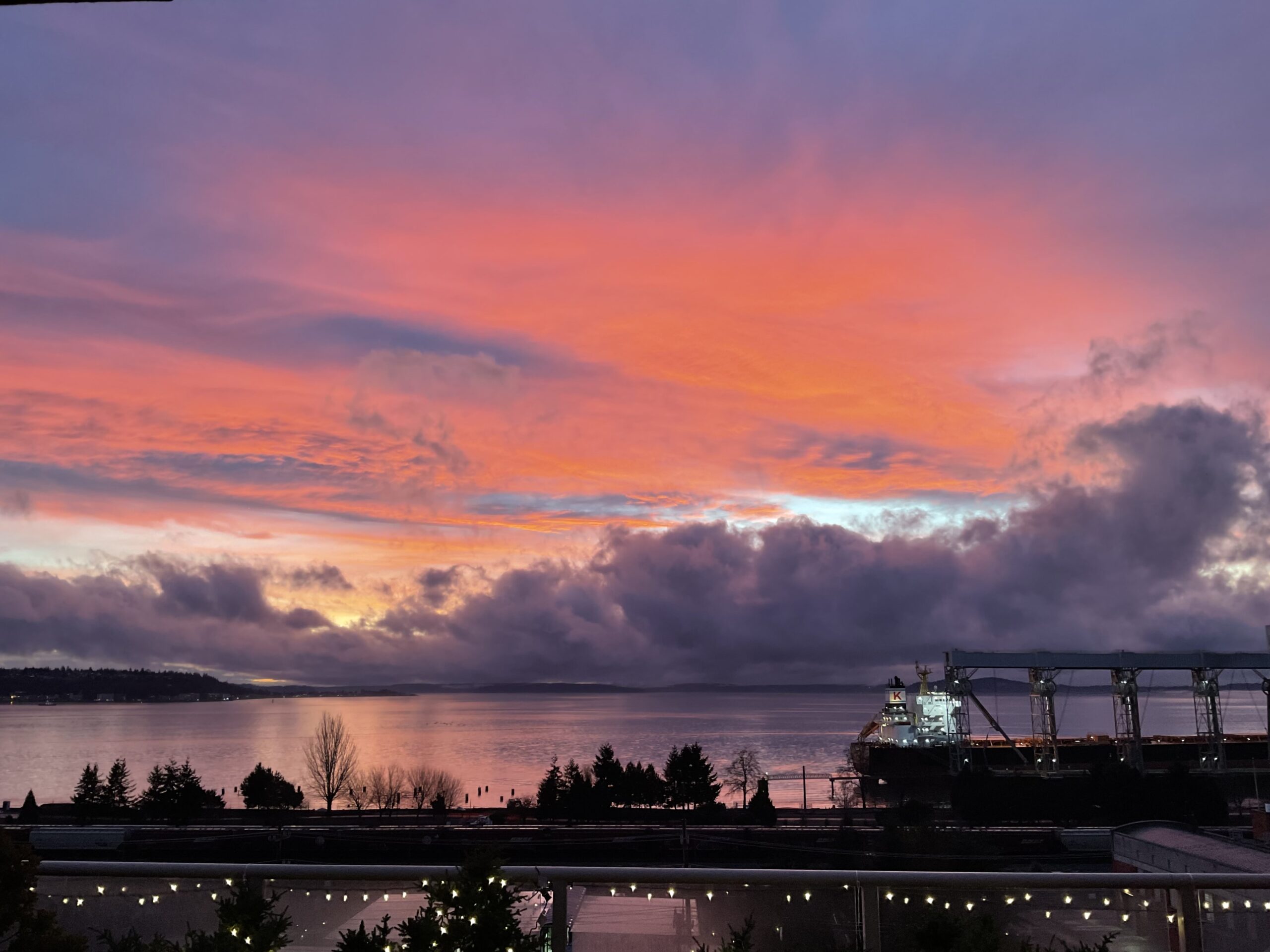 After a week of notable rainfall in the Pacific Northwest, a view of the sunset in an area where there is often a 'rain shadow' due to the nearby Olympic Mountains, spotted over Puget Sound, Seattle, Washington, US