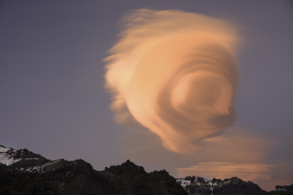 A dynamic, sideways-appearing Altocumulus lenticularis spotted over Fagurholsmyri, Iceland