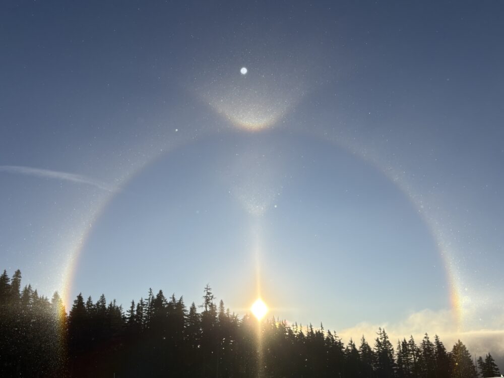 A plethora of optical phenomena, inclusive of a 22-degree halo, sun dogs, an upper tangent arc, and a sun pillar that leads upwards towards signs of a faint and rare v-shaped Moilanen arc, spotted by John's friend, Natalie Tercek, at sunrise before a day of skiing at Mt. Hood Meadows, Oregon, US.