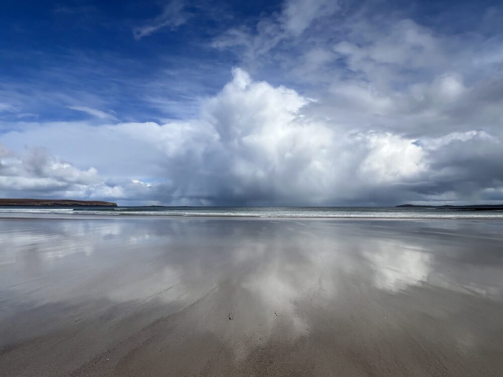 Cumulus congestus with a low cloud base, generating a reflection in the water and producing precipitation near Isle of Lewis, Scotland