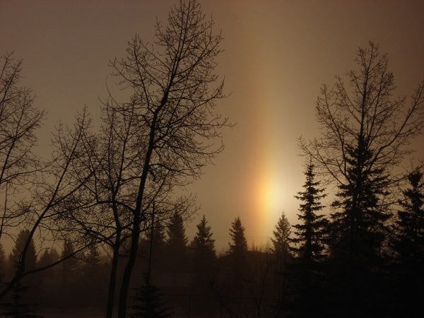 A sunrise sun dog over Calgary, Alberta, Canada.