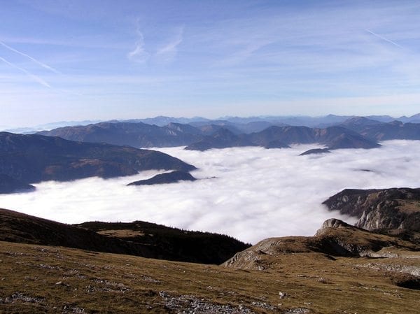 Cloud inversion seen from Schneeberg (2.075 m) in Austria, view in a western to southwestern direction over the eastern Alps.