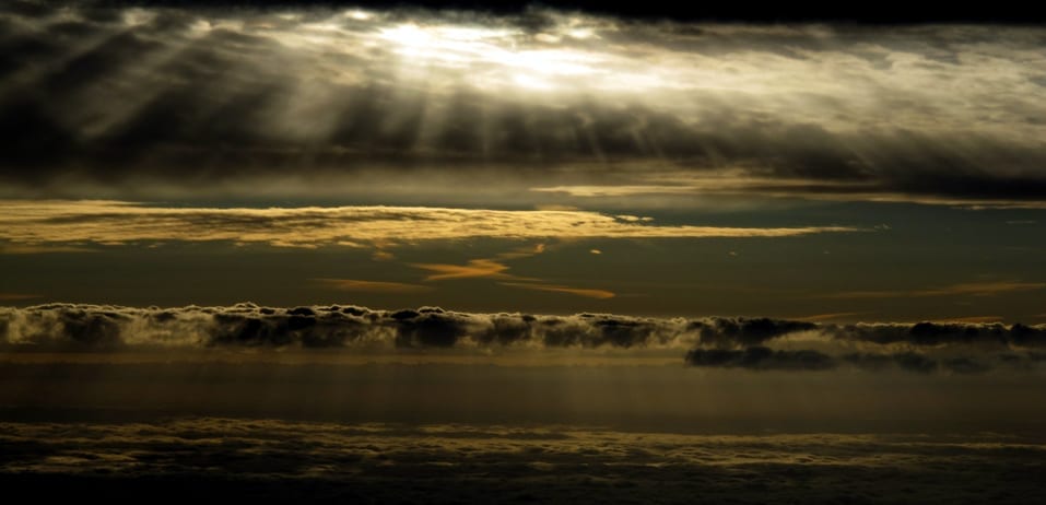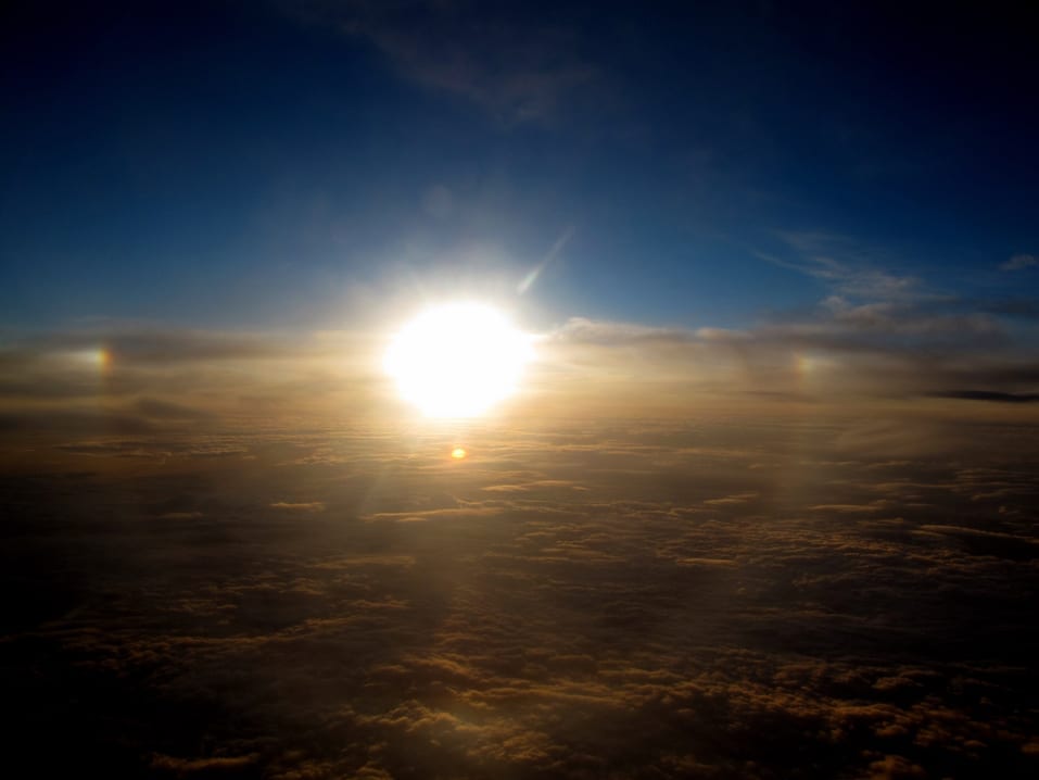 A sunburst between the layers, viewed from the flight deck over the Irish Sea, east of Dublin, Ireland.