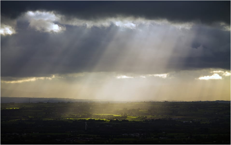 I love the way the clouds let the sunbeams shaft through to reach the ground and make the fields glow with a beautiful rich “billiard table” green. It is the clouds that make such a picture possible.